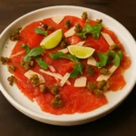 Finas lonjas de lomo de res acompañadas con rúgula, alcaparras fritas, aceite de oliva y queso Parmesano.