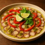 Finas lonjas de pulpo marinado, acompañado de pimentón rostizado y pesto de cilantro.